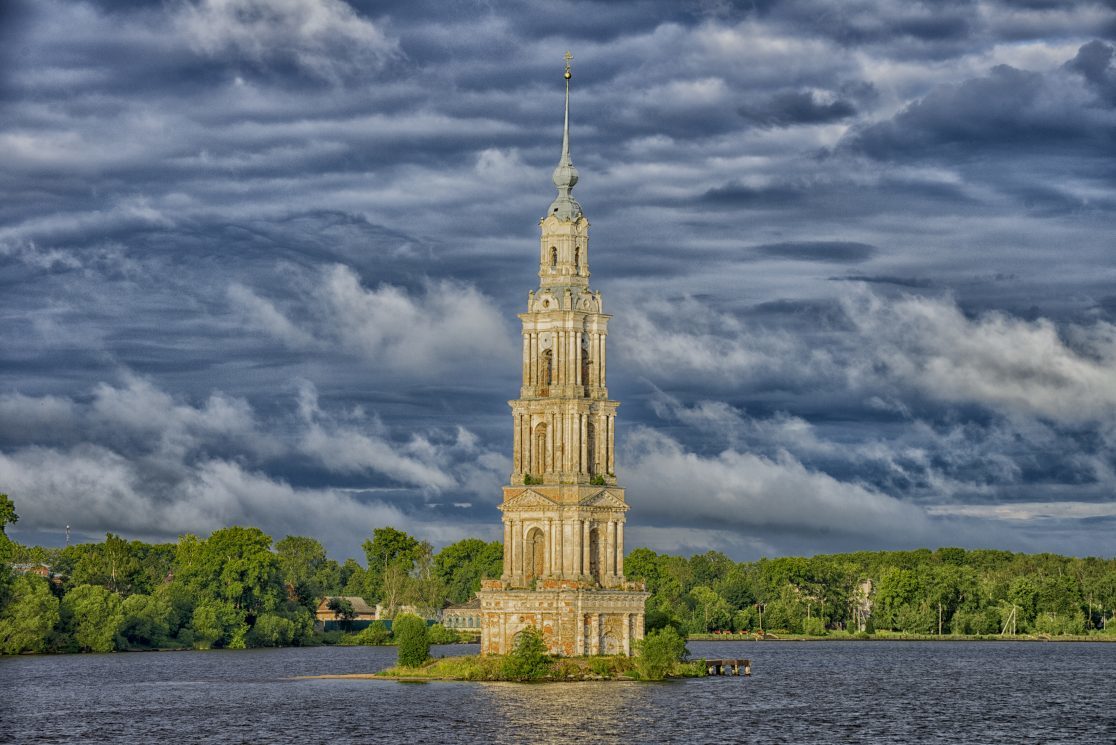 Kalyazin is one of the oldest towns on Volga. 2/3 of the city of Kalyazin and four dozen settlements of the Kalyazinsky district was absorbed by reservoir, made in 1939. Today, several streets, three churches, monastery islands and the belfry of St. Nicholas Cathedral remained from the former city. Now the stone bell tower of the Nicholas Cathedral is a monument of magnificent architecture, the main attraction of Kalyazin.